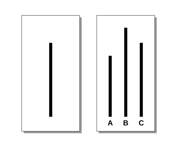 Los sujetos, tenían que ponerse en fila y contestar cuál de las líneas de la tarjeta de la derecha era igual de larga que la de la tarjeta izquierda. El truco estaba en que no todos eran sujetos de control, había actores delante del sujeto en la fila e iban contestando que todas eran iguales, de forma que al llegar su turno el sujeto de control daba la misma respuesta aun sabiendo que eran diferentes. Los participantes reales comenzaron a expresar emociones como la duda y la inseguridad, y casi un 40% de las veces acabaron escogiendo la opción incorrecta.