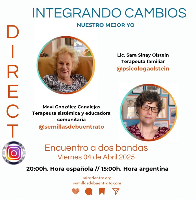 El encuentro tendrá lugar en Instagram y podrás verlo en cualquiera de las dos cuentas: @semillasdebuentrato o @psicologaolstein desde allí reflexionaremos con la Psicóloga y terapeuta familiar Sara Sinay Olstein sobre cómo integramos nuestros distintos Yo (físico, mental, emocional, espiritual y esencial) desde la visión de la segunda etapa de la vida.