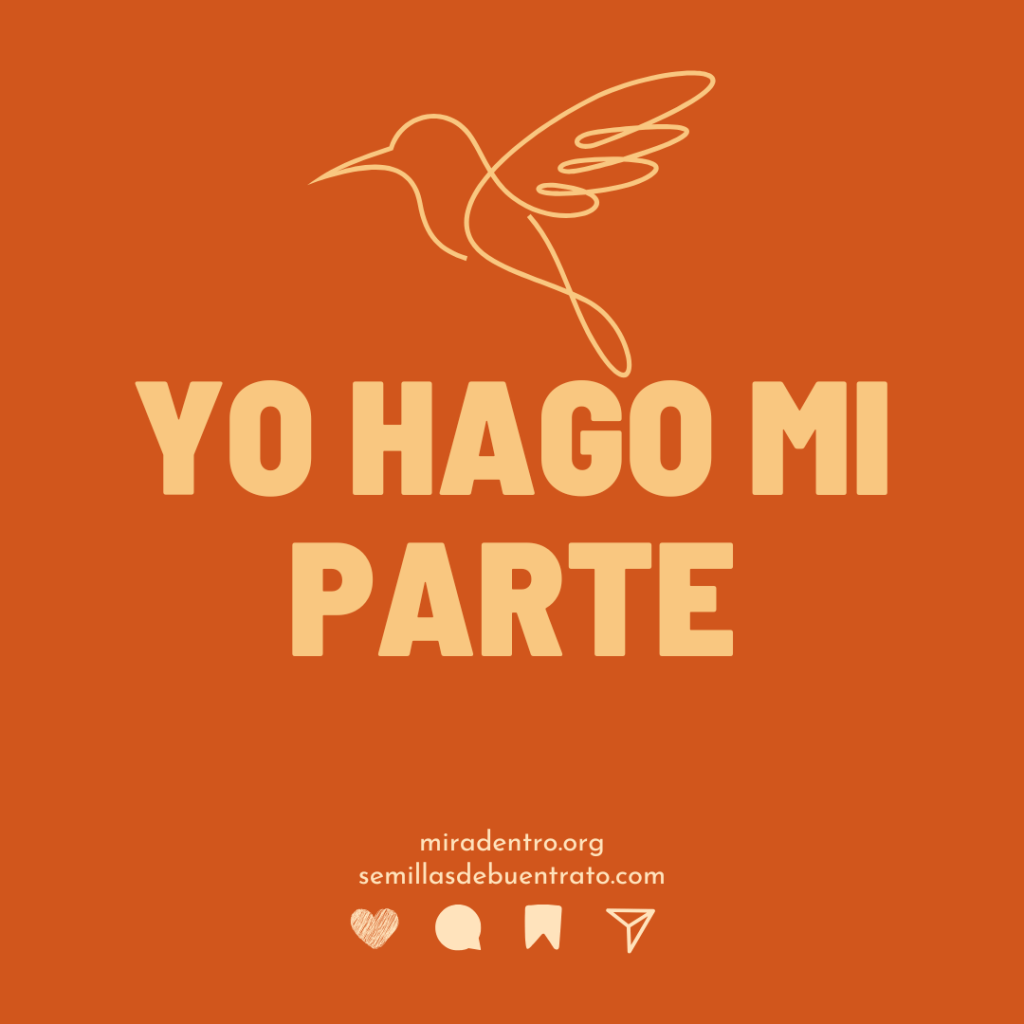 Yo hago mi parte, ¿Qué estás haciendo tú? Si la respuesta es nada o no lo suficiente podemos entrar en la barrena de la frustración y nada más lejos de nuestra intención. La pregunta no es para dañar, es para reflexionar porque podemos hacer mucho con pequeños gestos. No hace falta intentar salvar el mundo nosotras solas, pero sí hace falta que no nos mostremos indiferentes, hace falta que levantemos la voz desde donde podamos hacerlo, desde nuestros círculos más cercanos, desde nuestro derecho a votar, a manifestarnos, a comentar con datos certeros, a dar nuestra opinión con respeto. Podemos hacer mucho y a veces no hacemos nada.